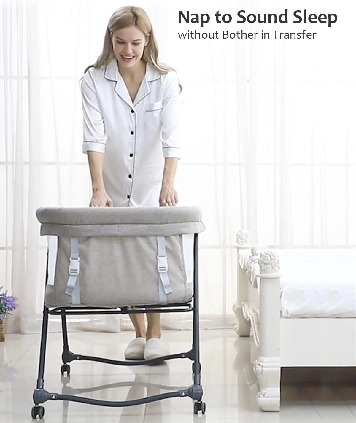 This baby bassinet adapts to your little one’s needs with two versatile modes. Switch the wheels to fixed mode to use it as a stable crib, or activate rocking mode to transform it into a gentle cradle—perfect for lulling your baby into a peaceful nap.
