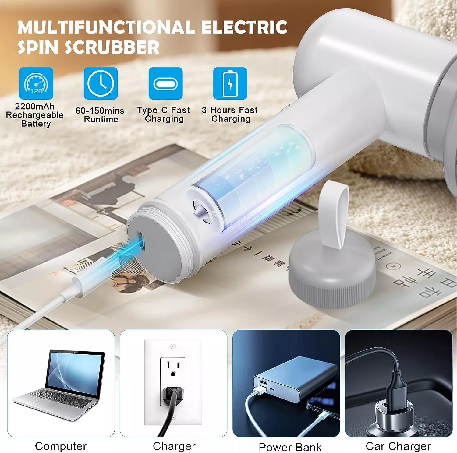 【Type-C Fast Charging】: The power scrubber brush is equipped with a 2200 mAh Type-C fast charging battery with 260 rpm and 360 rpm working speeds, which has a long battery life and is enough to meet your daily cleaning needs. (USB-C charging cable included).