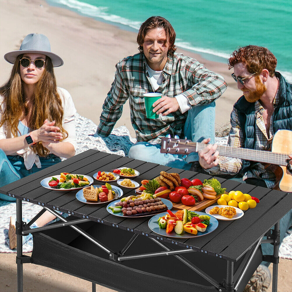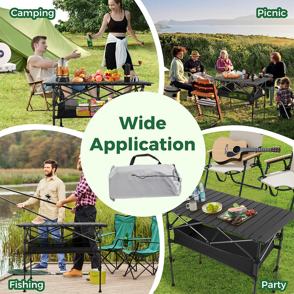 Foldable Height-Adjustable Camping Table – Roll-Up Picnic Table with Storage Basket & Carry Bag