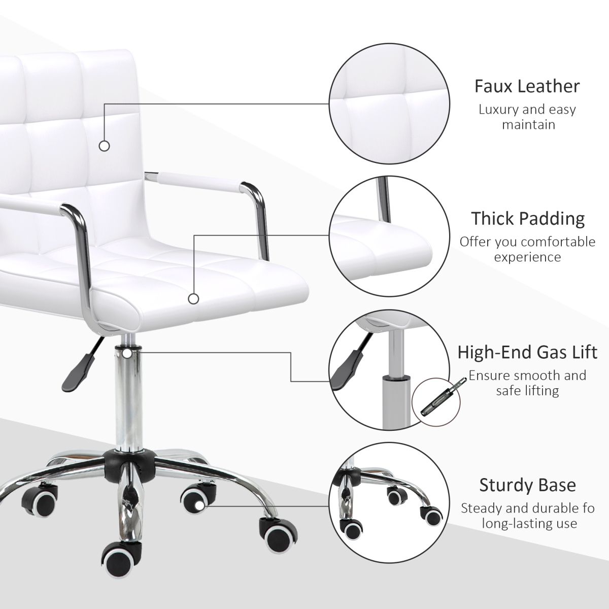 Mid Back PU Leather Home Office Chair Swivel Desk Chair with Arm, Wheel, White
