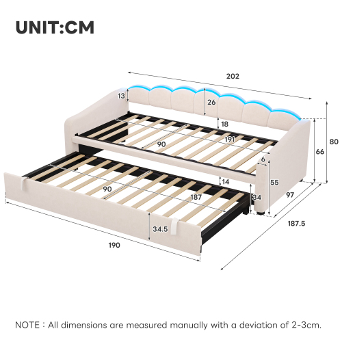 - [Space-saving Multiform Design] This daybed offers three convertible forms: sofa, trundle bed and daybed. With the straps and bottom wheels, it can be easily converted from a comfortable sofa to a spacious daybed. The single bed accommodating a 90x190cm mattress and the bottom of the bed features a trundle bed measuring a 90x187cm mattress with a thickness of 12-14cm.