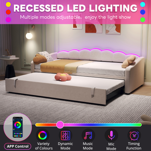 Product Name:Upholstered Bed 90x190cm, Daybed, Sofa Bed with RGB LED Lighting, 3ft Petal Shape Single Bed with Trundle,Pull out Trundle Bed for Living Room/ Bedroom/ Study Room, Velvet, Beige (No Mattress)